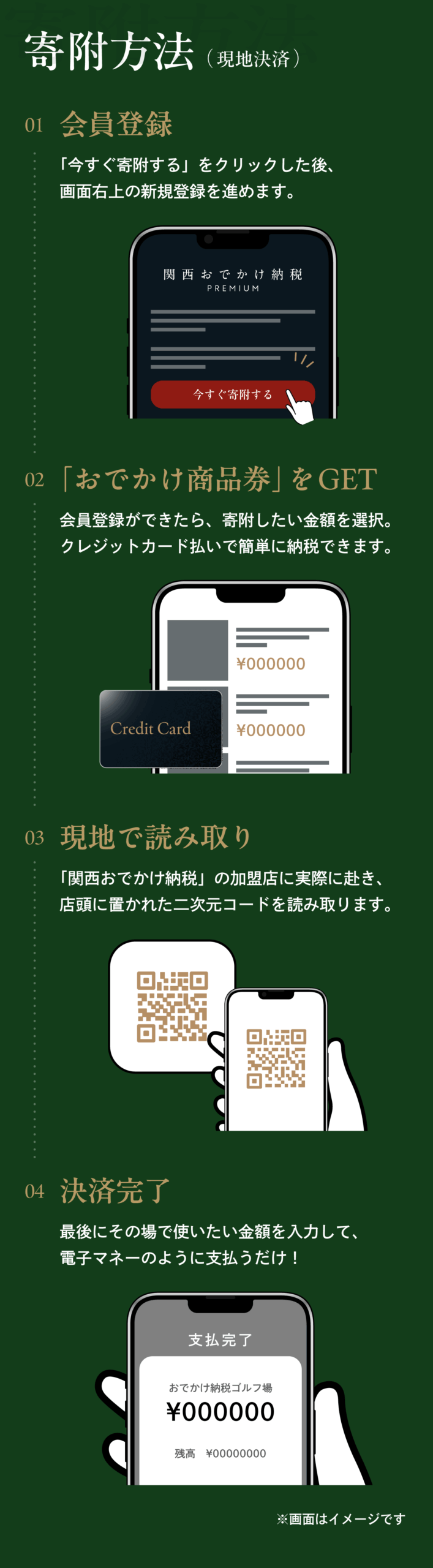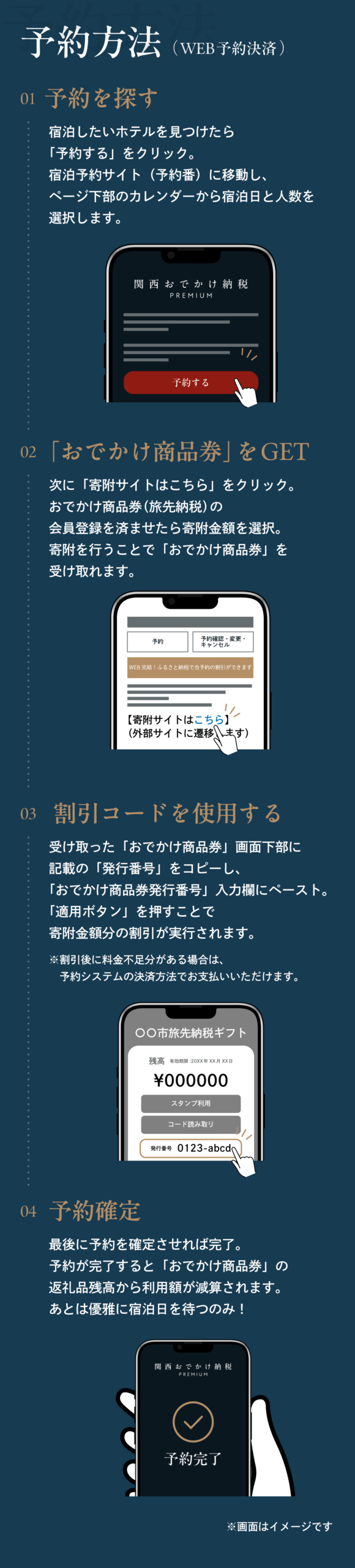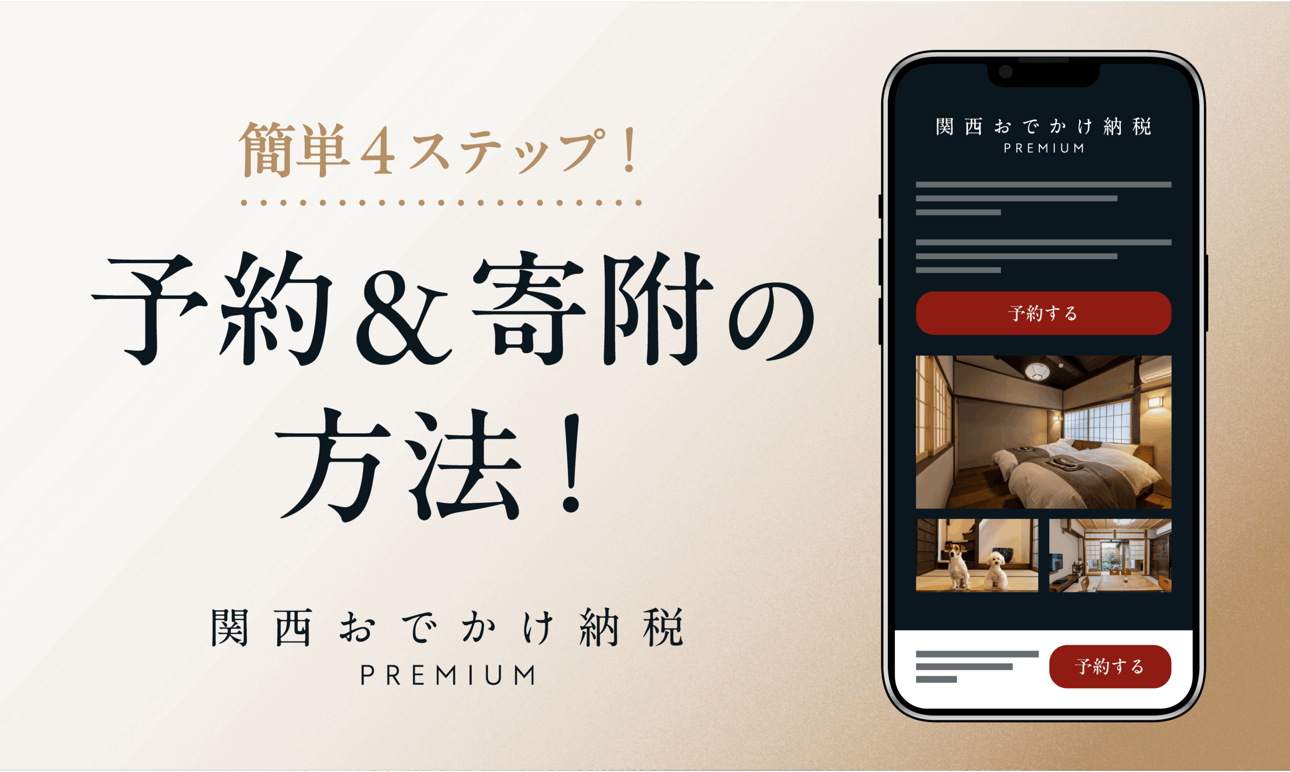2025.12.08 #予約方法 #使い方 #宿泊予約 #寄附方法 簡単4ステップ!予約&寄附の方法! 関西おでかけ納税プレミアムの予約&寄附のやり方について詳しくご紹介します!関西おでかけ納税プレミアムの「予約」と「寄附」のやり方についてご紹介。気になるホテルやレストラン、ゴルフ場を見つけたら、下記のSTEP1~4を参考に、予約・寄附を進めてください。<WEB予約決済の予約方法>さらに詳しく知りたい方はこちら <現地決済の寄附方法>さらに詳しく知りたい方はこちら